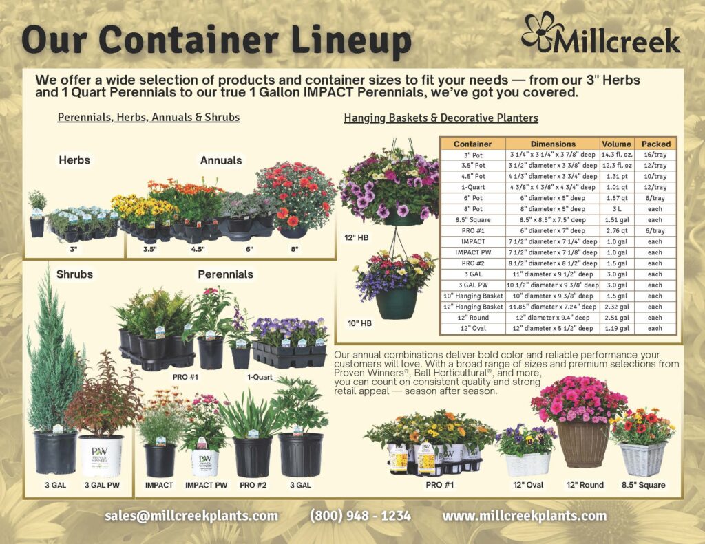 Millcreek offers plants in a wide range of container sizes. If you need something unique, our team can provide custom growing solutions tailored to you.